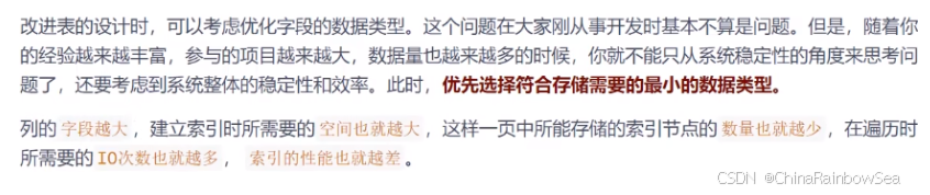 总之,遇到数据量大的项目时,一定要在充分了解业务需求的前提下,合理优化数据类型,这样才能充 分发挥资源的效率,使系统达到最优。