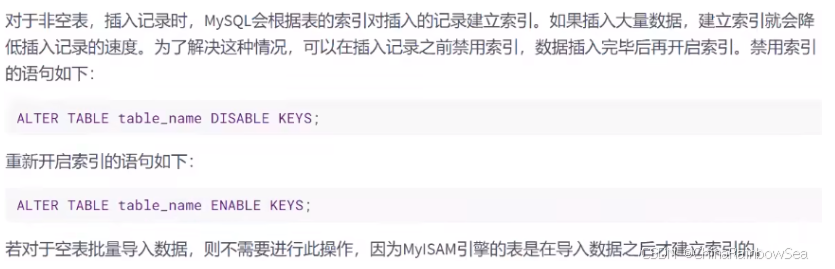 插入记录时,影响插入速度的主要是索引、唯一性校验、一次插入记录条数等。根据这些情况可以分别进行优化。这里我们分为MyISAM引擎和InnoDB引擎来讲。