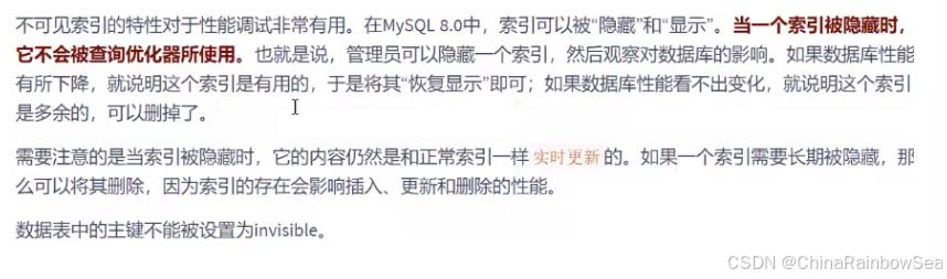 的值,该值统计了表中某一键所在的列不重复 的值的个数。该值越接近表中的总行数,则在表连接查询或者索引查询时,就越优先被优化器选择使用。也就是索引列的cardinality的值与表中数据的总条数差距越大,即使查询的时候使用了该索引作为查 询条件,存储引擎实际查询的时候使用的概率就越小。下面通过例子来验证下。cardinality可以通过 SHOW INDEX FROM 表名查看。
