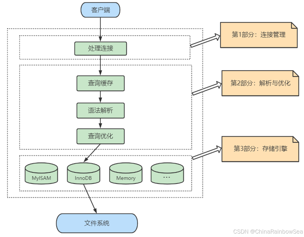 的方式存 在的,并完成与存储引擎的交互。当然有些存储引擎比如InnoDB,也支持不使用文件系统直接管理裸设 备,但现代文件系统的实现使得这样做没有必要了。在文件系统之下,可以使用本地磁盘,可以使用 DAS、NAS、SAN等各种存储系统。