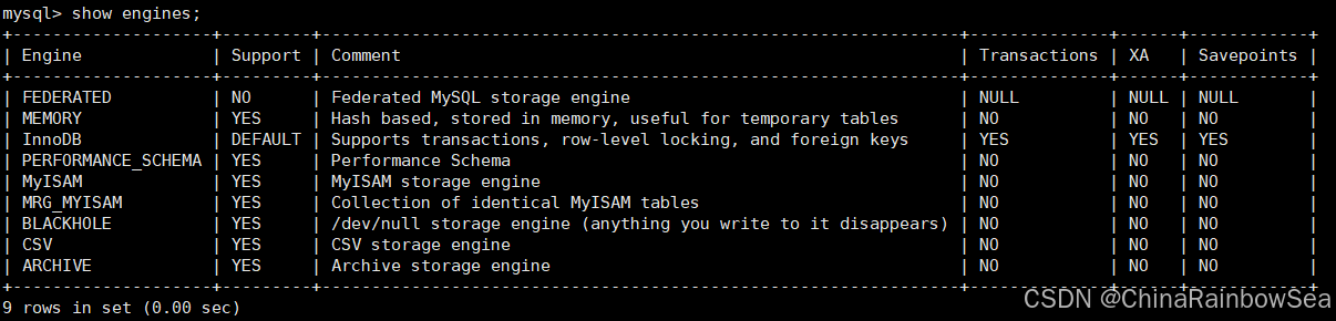 MySQL 8.0.25 默认支持的存储引擎如下: