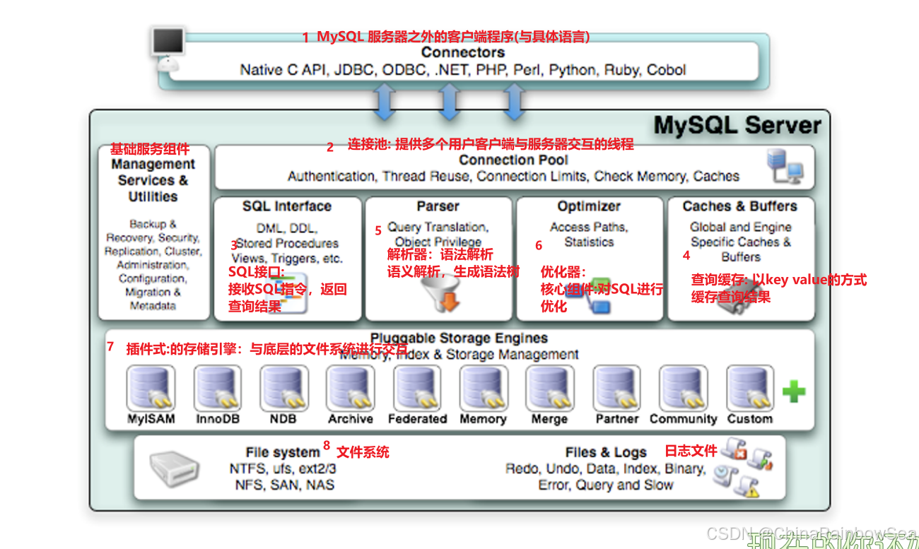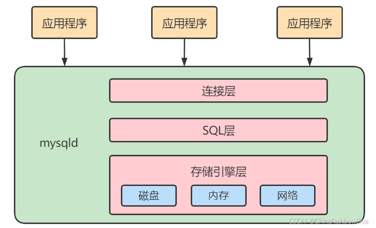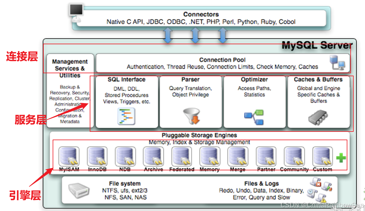 - SQL 层(服务层):对 SQL 语句进行查询处理;与数据库文件的存储方式无关;