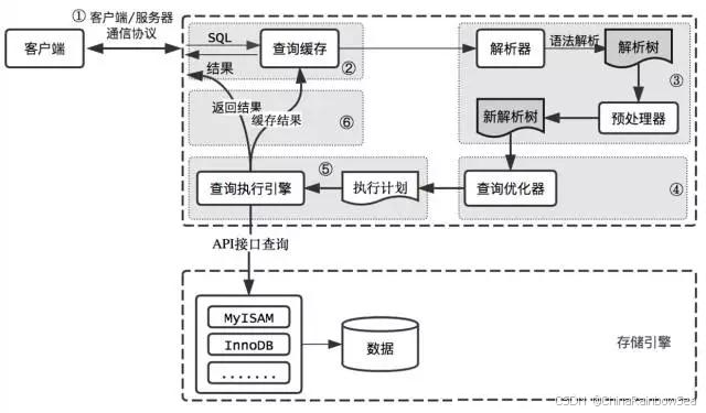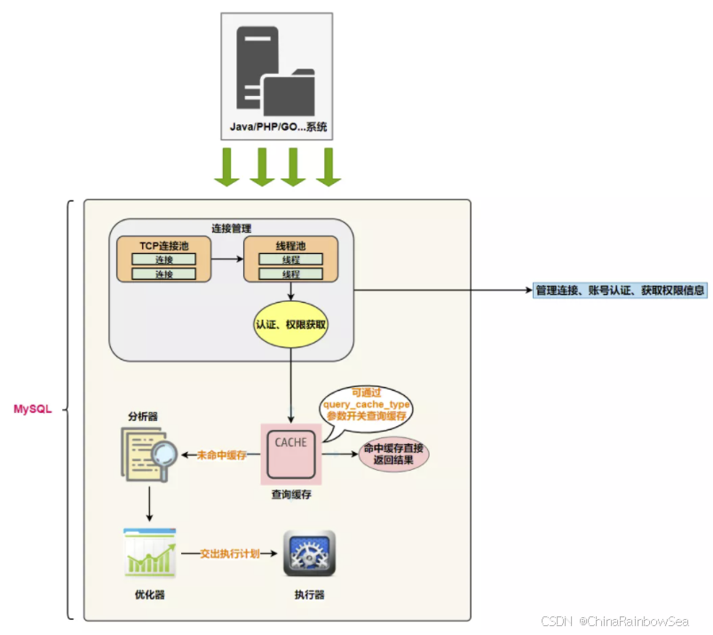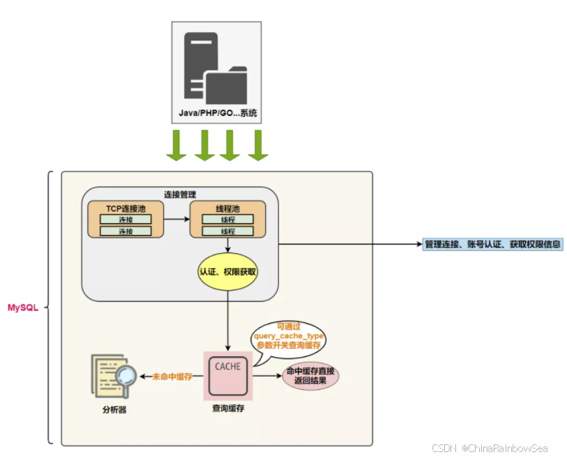 - MySQL内部维持着一些Cache和Buffer,比如Query Cache用来缓存一条SELECT语句的执行结 果,如果能够在其中找到对应的查询结果,那么就不必再进行查询解析、优化和执行的整个过 程了,直接将结果反馈给客户端。
