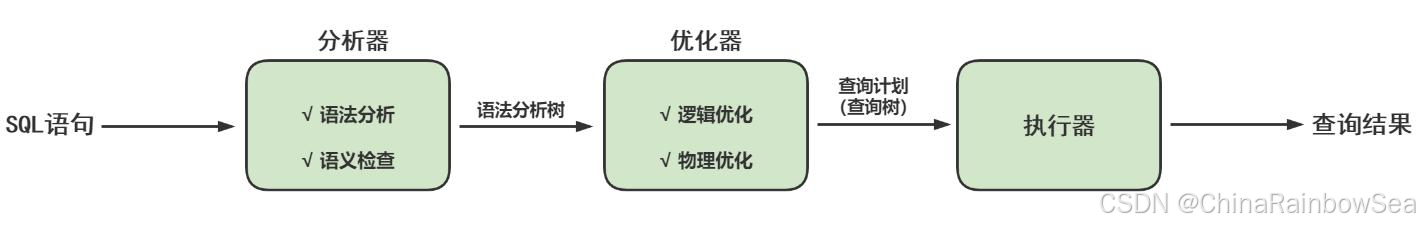 SQL 语句在 MySQL 中的流程是: SQL语句→查询缓存→解析器→优化器→执行器 。