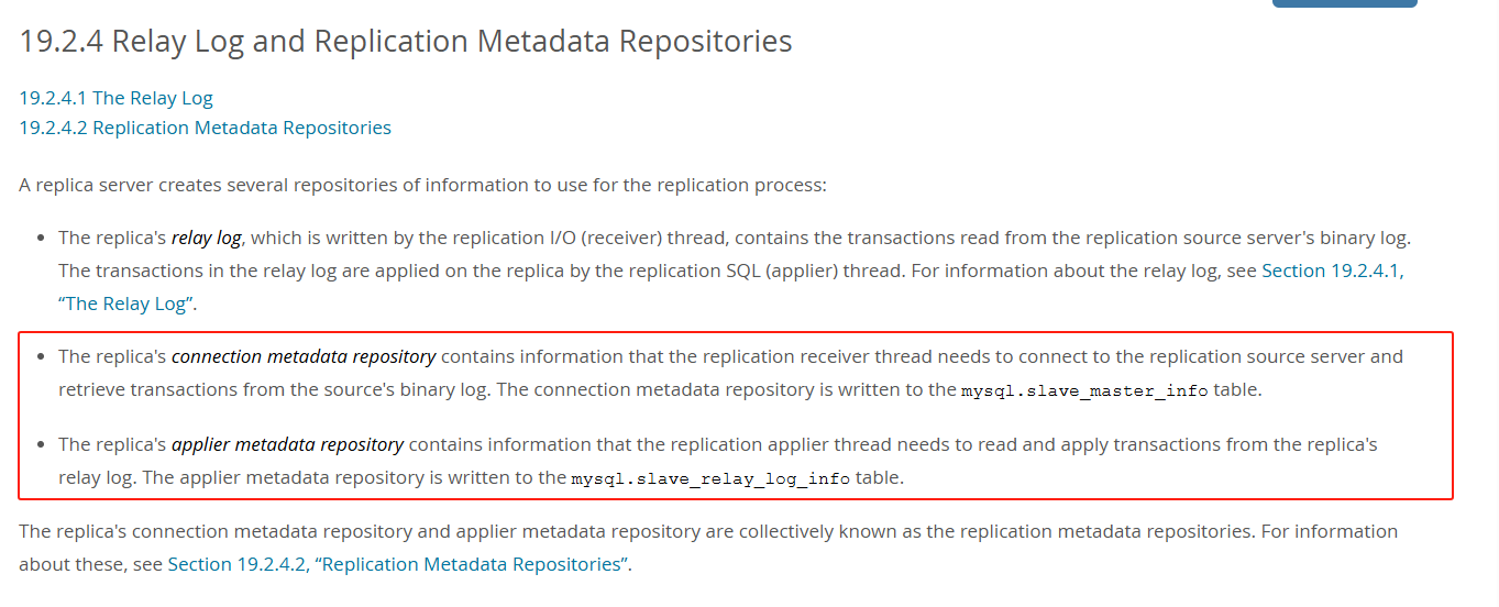 语句。官方文档的这两段描述可以解释为什么在数据库服务启动之后,同步关系会自动建立,若主库状态正常,且binlog文件保存完整,则I/O和SQL线程状态都为YES。