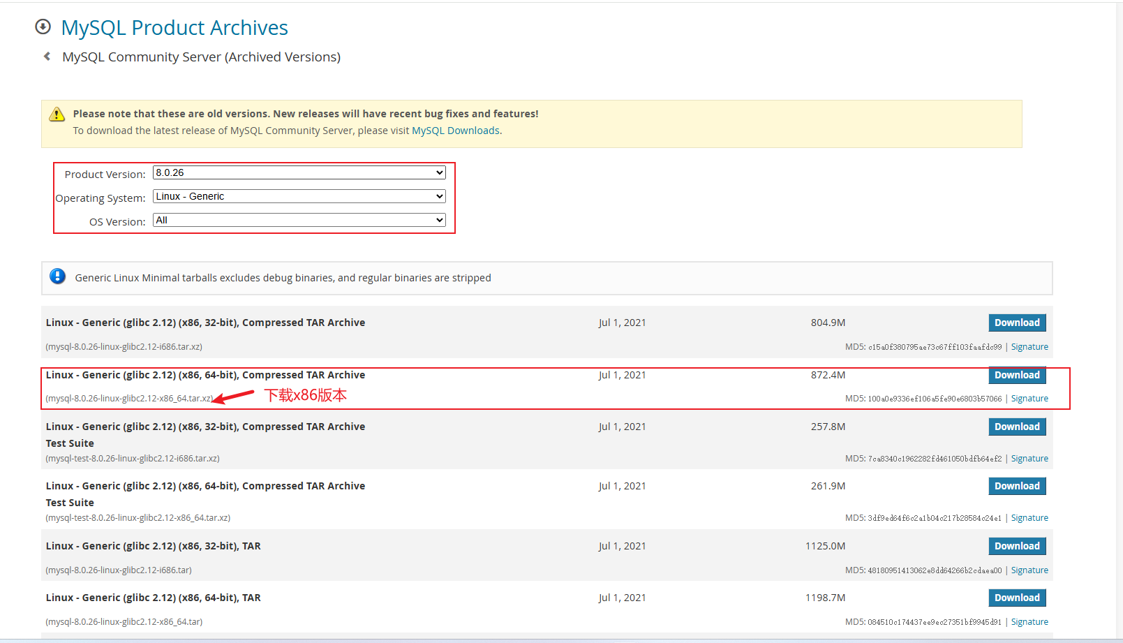 wget https://downloads.mysql.com/archives/get/p/23/file/mysql-8.0.26-Linux-glibc2.12-x86_64.tar.xz