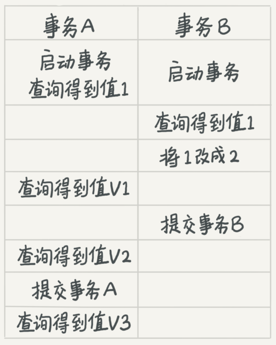 可重复读:事务A在执行过程中看到的数据,和事务A启动时看到的是一样的,因此V1=V2=1。由于之后事务A提交,因此V3=2。