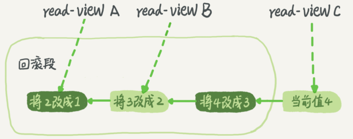 在MySQL中,实际上每条记录在更新时都会同时记录一条回滚操作。记录上的最新值,通过回滚操作,都可以得到提前一个状态的值。假设一个值从1依次改成了2,3,4,那么回滚日志是下面这样的: