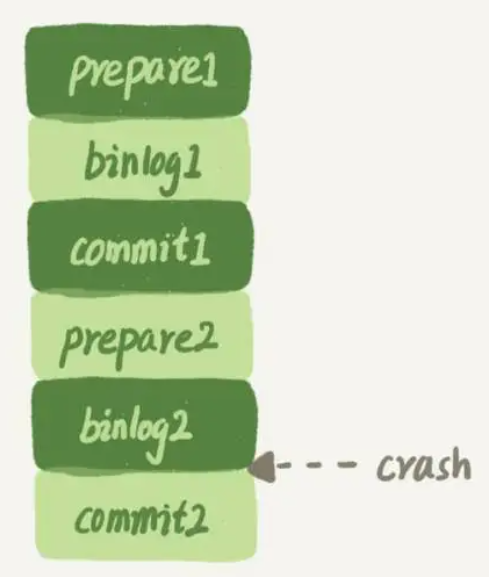 如图,假如在binlog2写完但整个事务还没有commit时,MySQL发生crash,重启后引擎内部事务2会回滚,但对于事务1来说,系统认为已经提交完成,不会再应用一次binlog1。