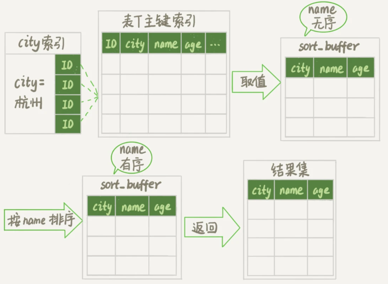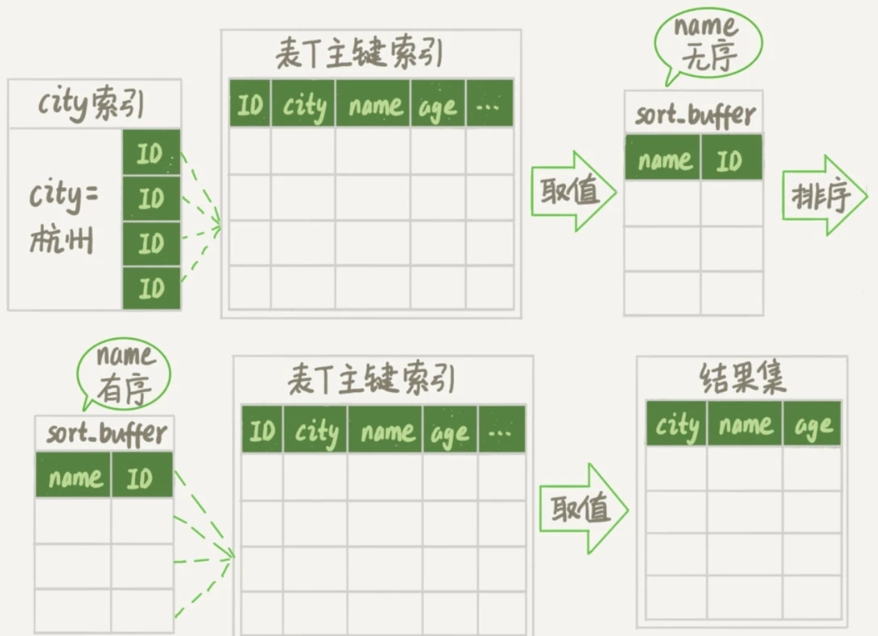 新算法放入sort_buffer的字段只有要排序的列name和主键id,由于排序结果缺少部分字段,不能直接返回,整个执行流程变为: