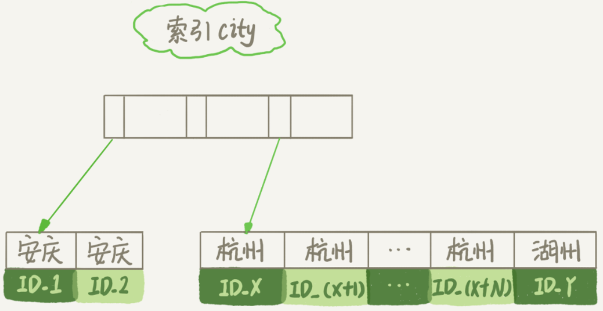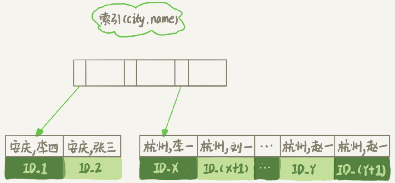 为了说明该语句的执行过程,先看一下city索引的示意图: