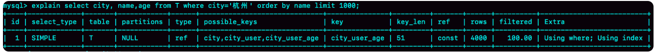 select city,name,age from t where city='杭州' order by name limit 1000;