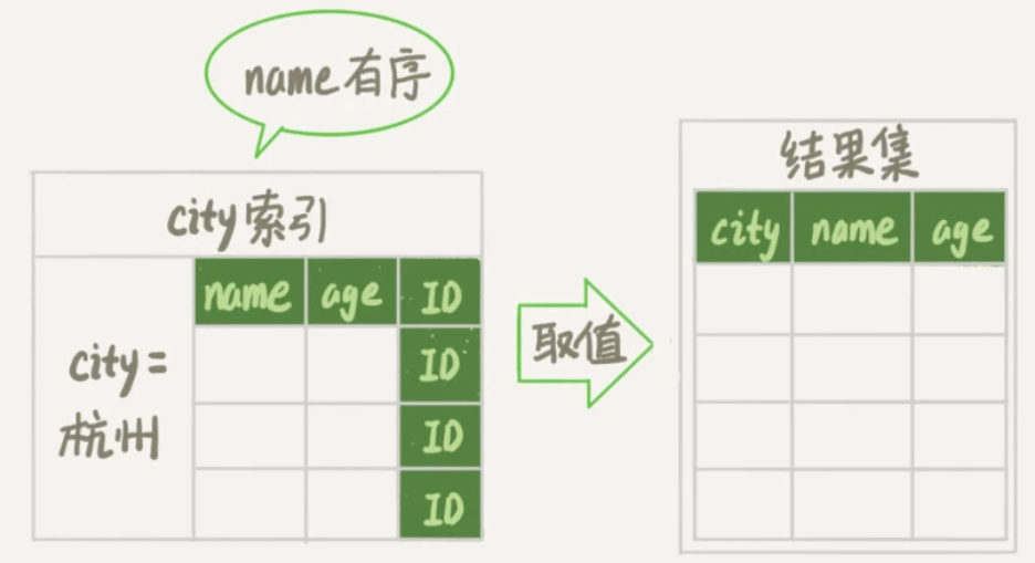 的记录,取name、city、age字段的值作为结果集的一部分直接返回;