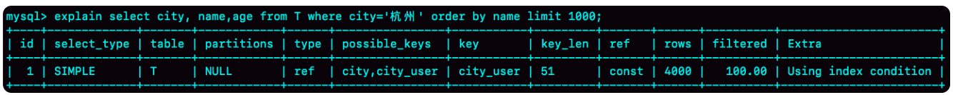 select city, name,age from t where city='杭州' order by name limit 1000;