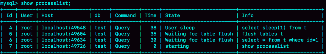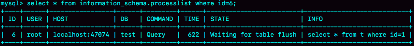 其中Waiting for table flush状态表示,现在有一个线程正要对表t做flush操作。MySQL里对表做flush操作的用法,一般有以下两个: