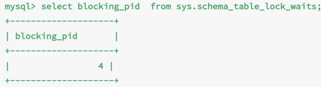 对于这种情况,可以通过查询sys.schema_table_lock_waits表,直接找出造成阻塞的process id,然后kill这个连接。