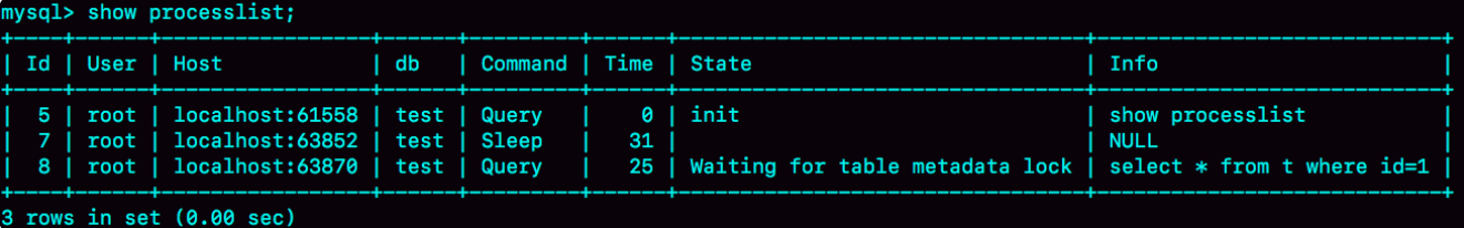 其中Waiting for table metadata lock状态表示,现在有一个线程正在表t上请求或者持有MDL写锁,将select语句堵住了。