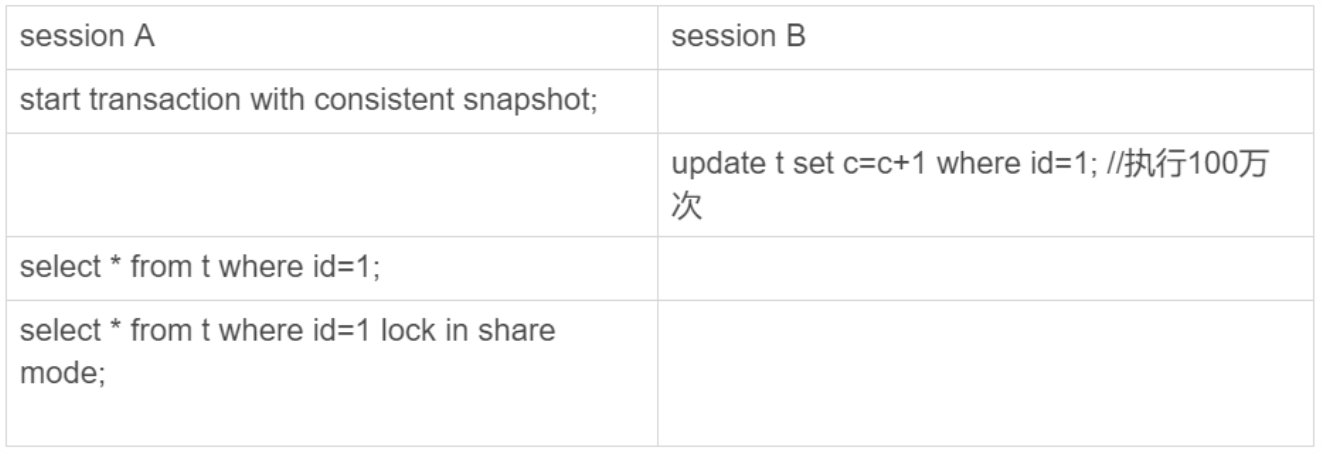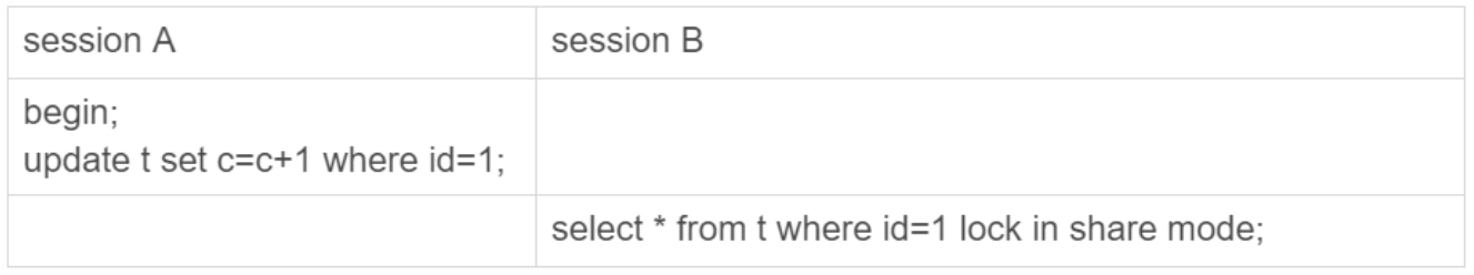 session A先启动了事务,然后session B开始执行update语句。更新完成后,id=1