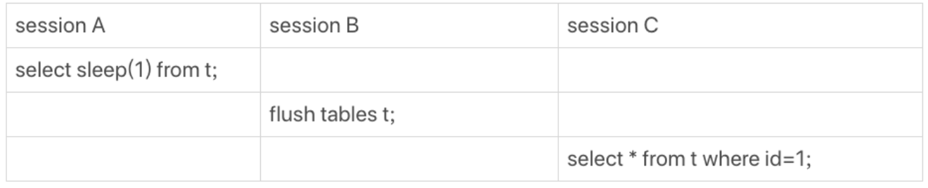 在session A中,每行都调用一次sleep(1),这样对于10万行的表,该语句默认执行10万秒,在这期间表t一直被session A“打开”着。然后,session B想要关闭表t就需要等session A查询结束,而session C会被flush命令堵住。
