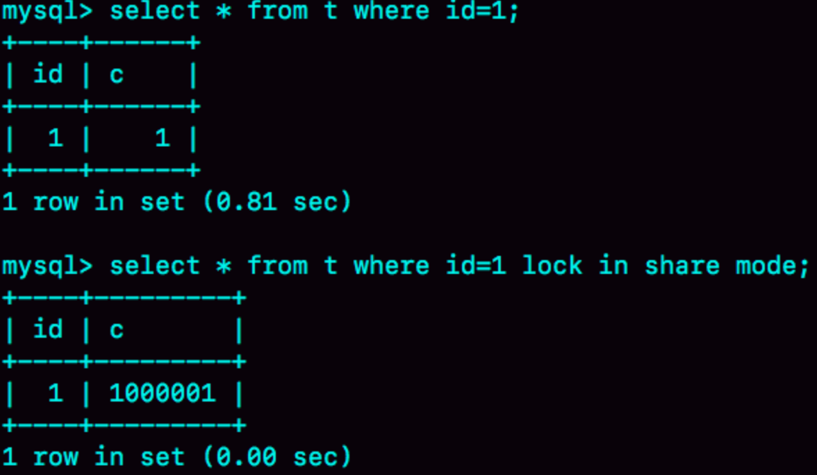 第二个查询语句是当前读,会直接读到1000001这个结果,所以速度很快;而第一个查询语句是一致性读,需要回滚100万次得到1这个结果,因此速度很慢。