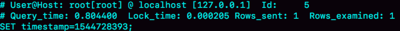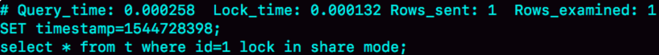 继续看slow log下面的内容,是下一个语句,扫描行数1行,执行时间为0.2ms: