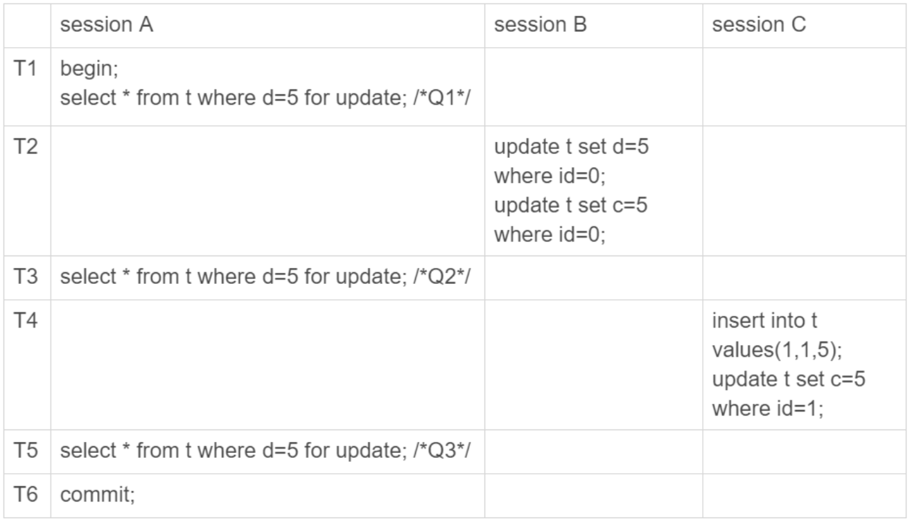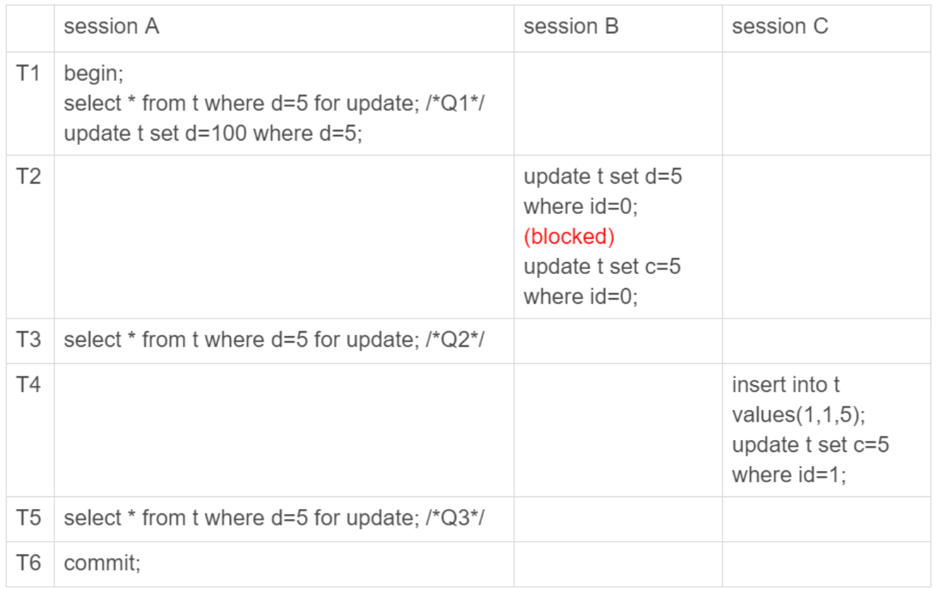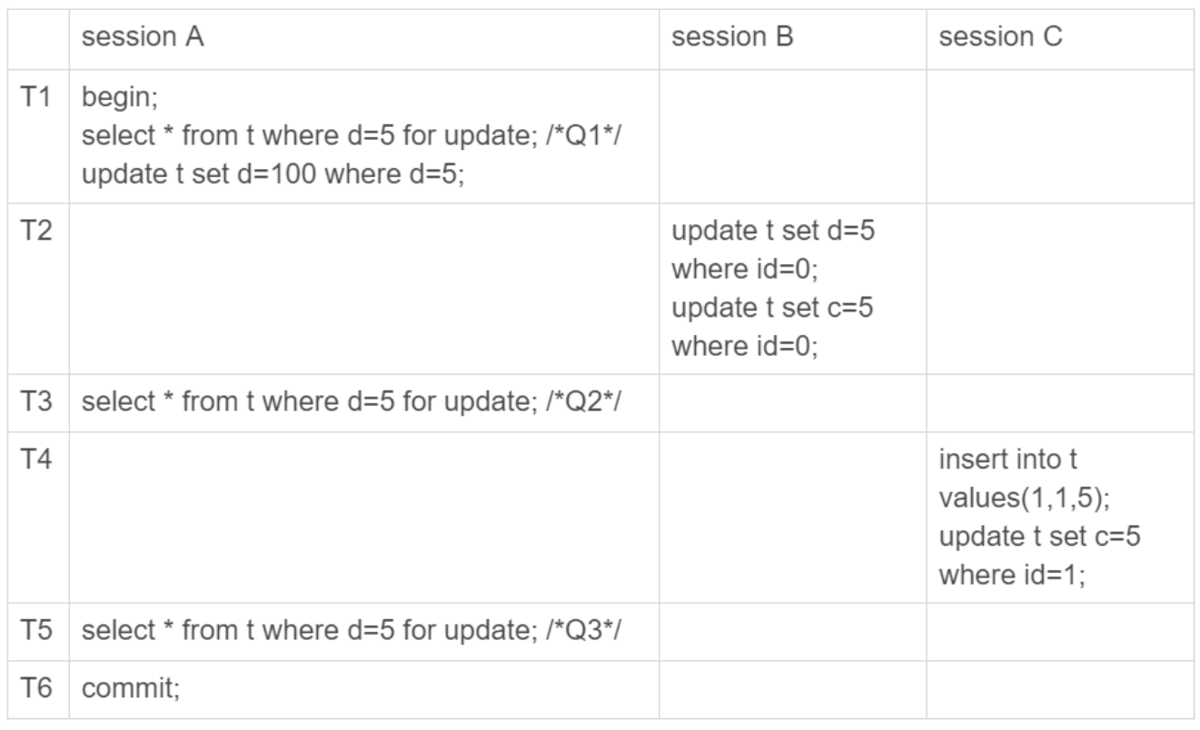 首先是语义上的问题。session A在T1时刻的语句实际上想要声明,要把所有d=5