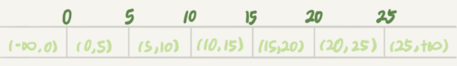 把整个表所有记录锁起来,会形成7个临键锁,分别是\((-\infty,0],(0,5],(5,10],(10,15],(15,20],(20,25],(25,+\text{supremun}]\)。