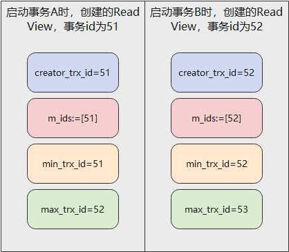 假设事务 A (事务 id 为51)启动后,紧接着事务 B (事务 id 为52)也启动了,那这两个事务创建的 Read View 如下: