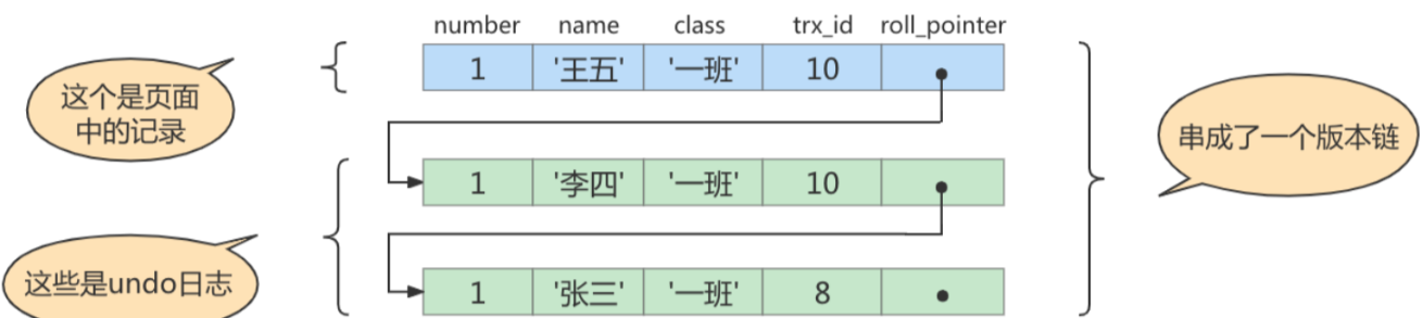 事务 B 在找到这条记录时,会看这条记录的 trx_id 是 51,在事务 B 的 Read View 的 min_trx_id 和 max_trx_id 之间,接下来需要判断 trx_id 值是否在 m_ids 范围内,判断的结果是在的,那么说明这条记录是被还未提交的事务修改的,这时事务 B 并不会读取这个版本的记录。而是,沿着 undo log 链条往下找旧版本的记录,直到找到 trx_id 小于 事务 B 的 Read View 中的 min_trx_id 值的第一条记录,所以事务 B 能读取到的是 trx_id 为 50 的记录,也就是zhangsan的账户余额为 100 的这条记录。