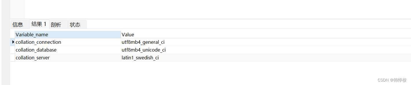 -- 查看数据库中的字符集 show variables where Variable_name like '%collation%'