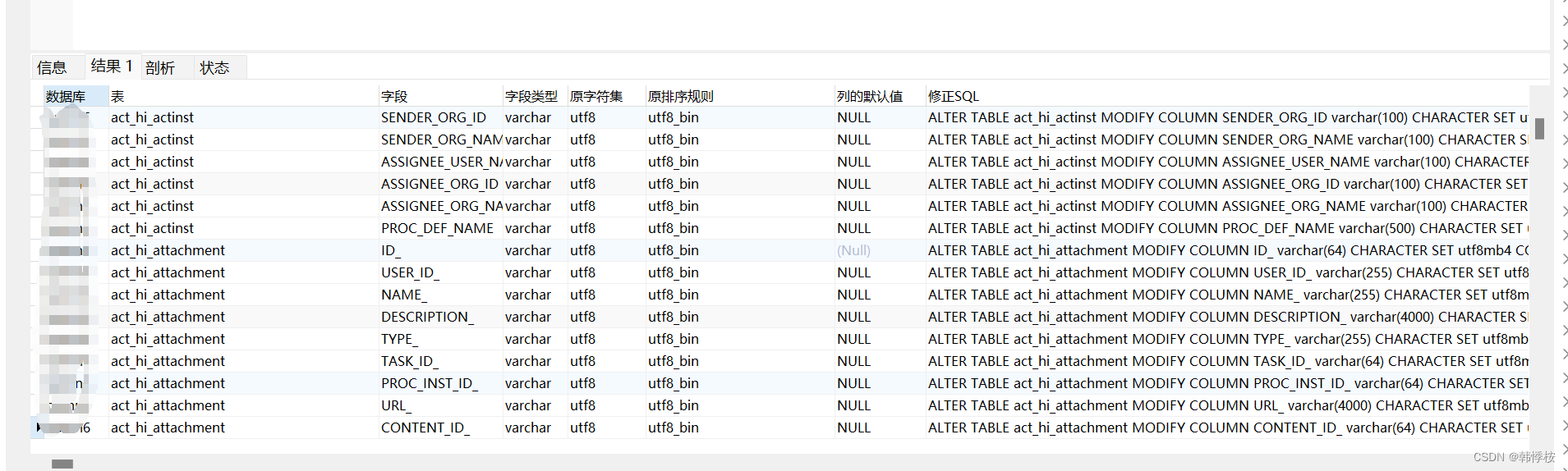 -- 查看数据库中所有字段用的排序规则 SELECT TABLE_SCHEMA '数据库', TABLE_NAME '表', COLUMN_NAME '字段', DATA_TYPE '字段类型', CHARACTER_SET_NAME '原字符集', COLLATION_NAME '原排序规则', COLUMN_DEFAULT '列的默认值', CONCAT( 'ALTER TABLE ', TABLE_NAME, ' MODIFY COLUMN ', COLUMN_NAME, ' ', COLUMN_TYPE, -- - 设置新的编码和排序规则 ' CHARACTER SET utf8mb4 COLLATE utf8mb4_general_ci', ( CASE WHEN IS_NULLABLE = 'NO' THEN ' NOT NULL' ELSE '' END ), ( CASE WHEN COLUMN_COMMENT = '' THEN ' ' ELSE concat( ' COMMENT''', COLUMN_COMMENT, '''' ) END ), ( CASE WHEN COLUMN_DEFAULT is NULL THEN ' ' ELSE concat('DEFAULT ''' , COLUMN_DEFAULT, '''') END ), ';' ) '修正SQL' FROM information_schema.`COLUMNS` WHERE -- 过滤正确排序规则 COLLATION_NAME != 'utf8mb4_general_ci' -- 数据库名称 AND TABLE_SCHEMA = 'ms_db' -- 修改varcahr和text类型的字段 -- AND (DATA_TYPE = 'varchar' OR DATA_TYPE = 'text' OR DATA_TYPE = 'longtext')