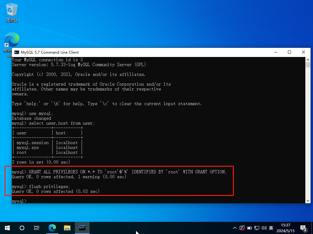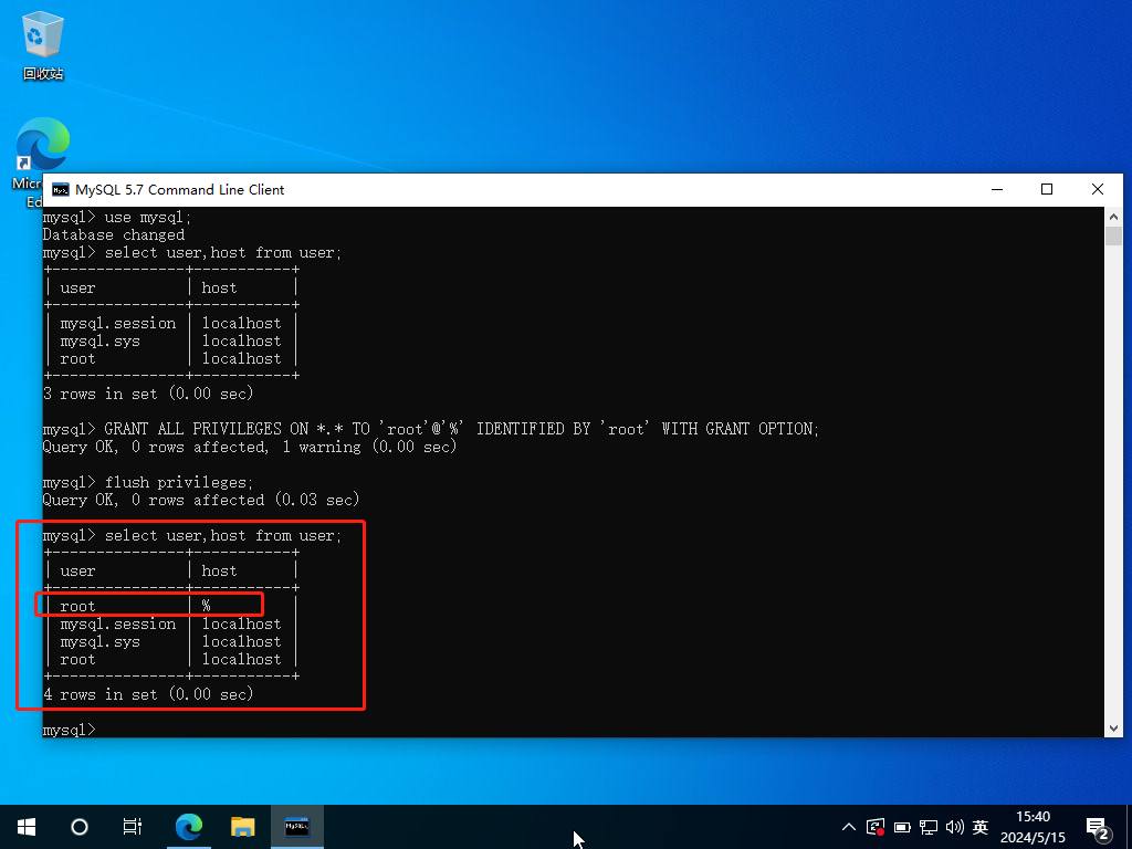 如上图所示,MySQL 的用户表多了一行记录, user=root、Host=% ,表示 root 账号能通过任何 IP 地址客户端登录。