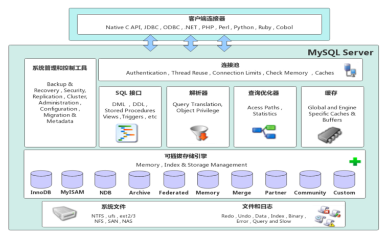 最上层是一些客户端和链接服务,包含本地sock 通信和大多数基于客户端/服务端工具实现的类似于TCP/IP的通信。主要完成一些类似于连接处理、授权认证、及相关的安全方案。在该层上引入了线程池的概念,为通过认证安全接入的客户端提供线程。同样在该层上可以实现基于SSL的安全链接。服务器也会为安全接入的每个客户端验证它所具有的操作权限。