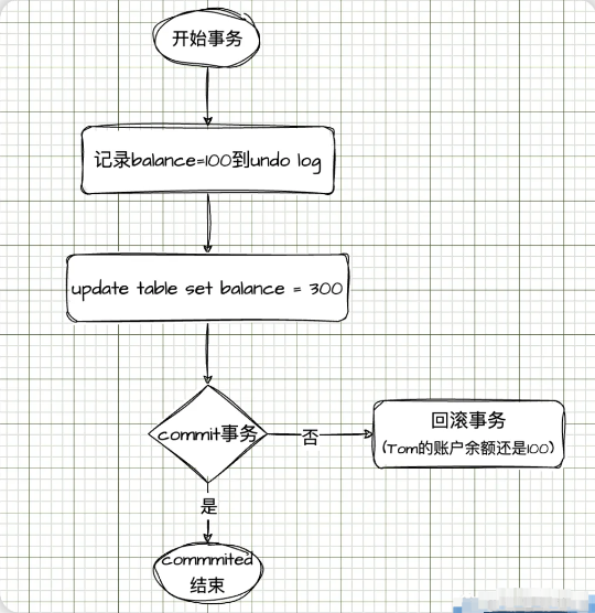 比如现在Tom的账户余额有100,现在有一个事务需要把Tom的账户余额更新为300,大致的流程如下图: