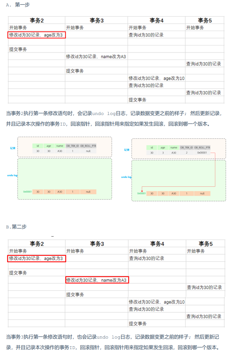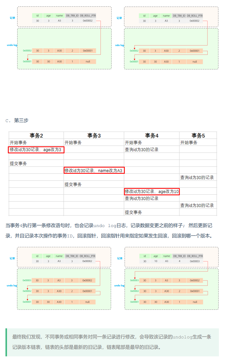 不同事务或相同事务对同一条记录进行修改,会导致该记录的undolog生成一条记录版本链表,链表的头部是最新的旧记录,链表尾部是最早的旧记录。