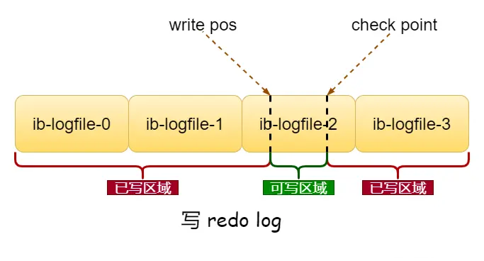 write pos 到 check point 之间的部分是 redo log 的未写区域,可用于记录新的记录;check point 到 write pos 之间是 redo log 已写区域,是待刷盘的数据页更改记录。