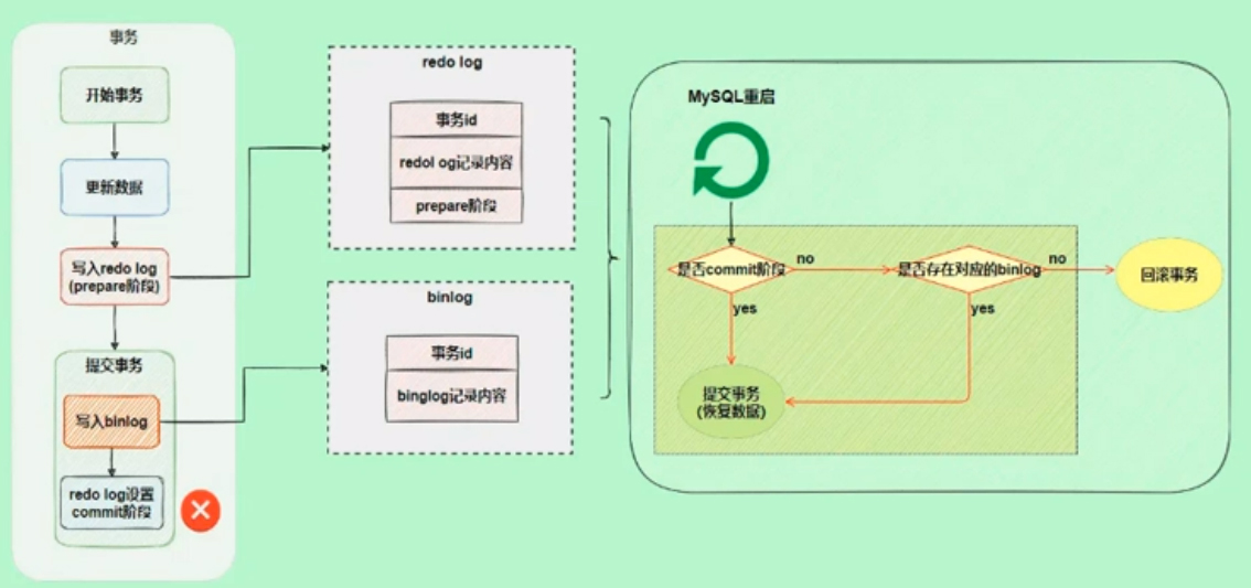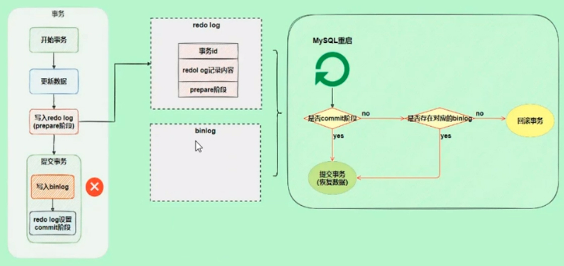 使用两阶段提交后,写入binlog时发生异常也不会有影响,因为MySQL根据redo log日志恢复数据时,发现redo log还处于prepare阶段,并且没有对应binlog日志,就会回滚该事务