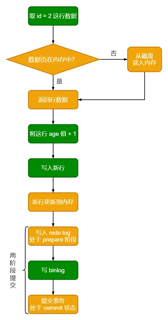 整个过程如下图所示,其中橙色框表示是在 InnoDB 内部执行的,绿色框表示是在执行器中执行的: