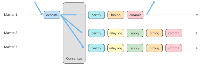 将多个节点共同组成一个复制组,在执行读写(RW)事务时,需要通过一致性协议层同意,当同意节点数量大于(N/2+1)时才可进行提交,针对只读(RO)事务则不需要组内同意,直接COMMIT即可