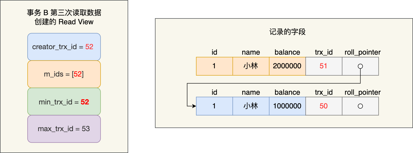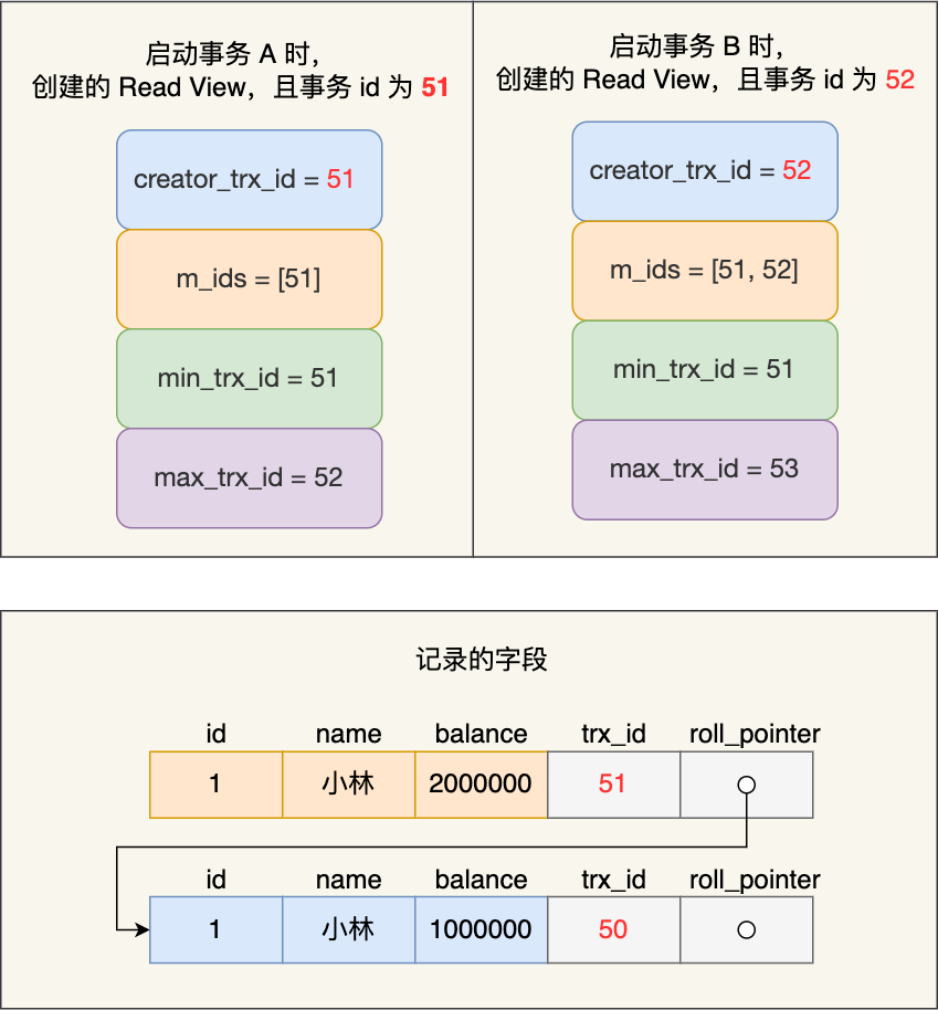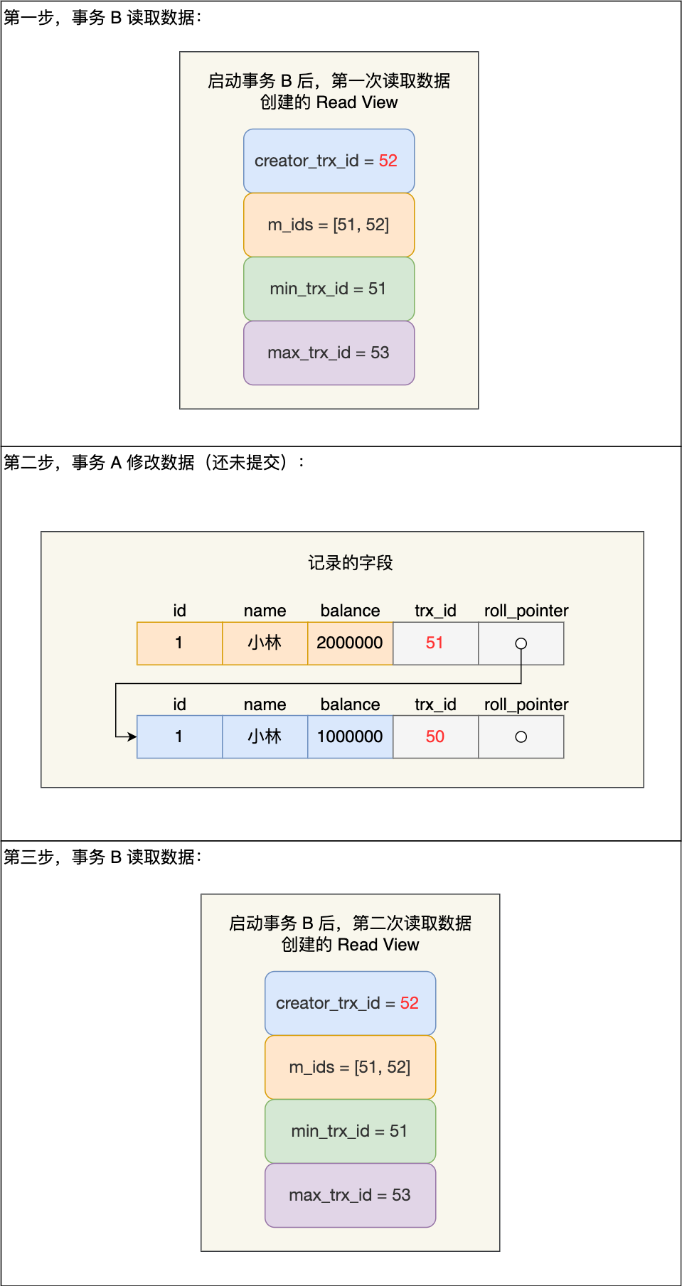 假设有A和B这两个事务同时在处理,事务A先开始从数据库中读取余额数据,然后继续执行代码逻辑处理,在这过程中如果事务B更新了这条数据,并提交了事务,那么当事务A再次读取这条数据时就会发现前后两次读取到的数据是不一致的,这种现象就被称为不可重复读