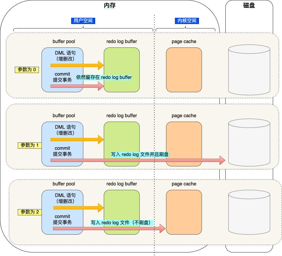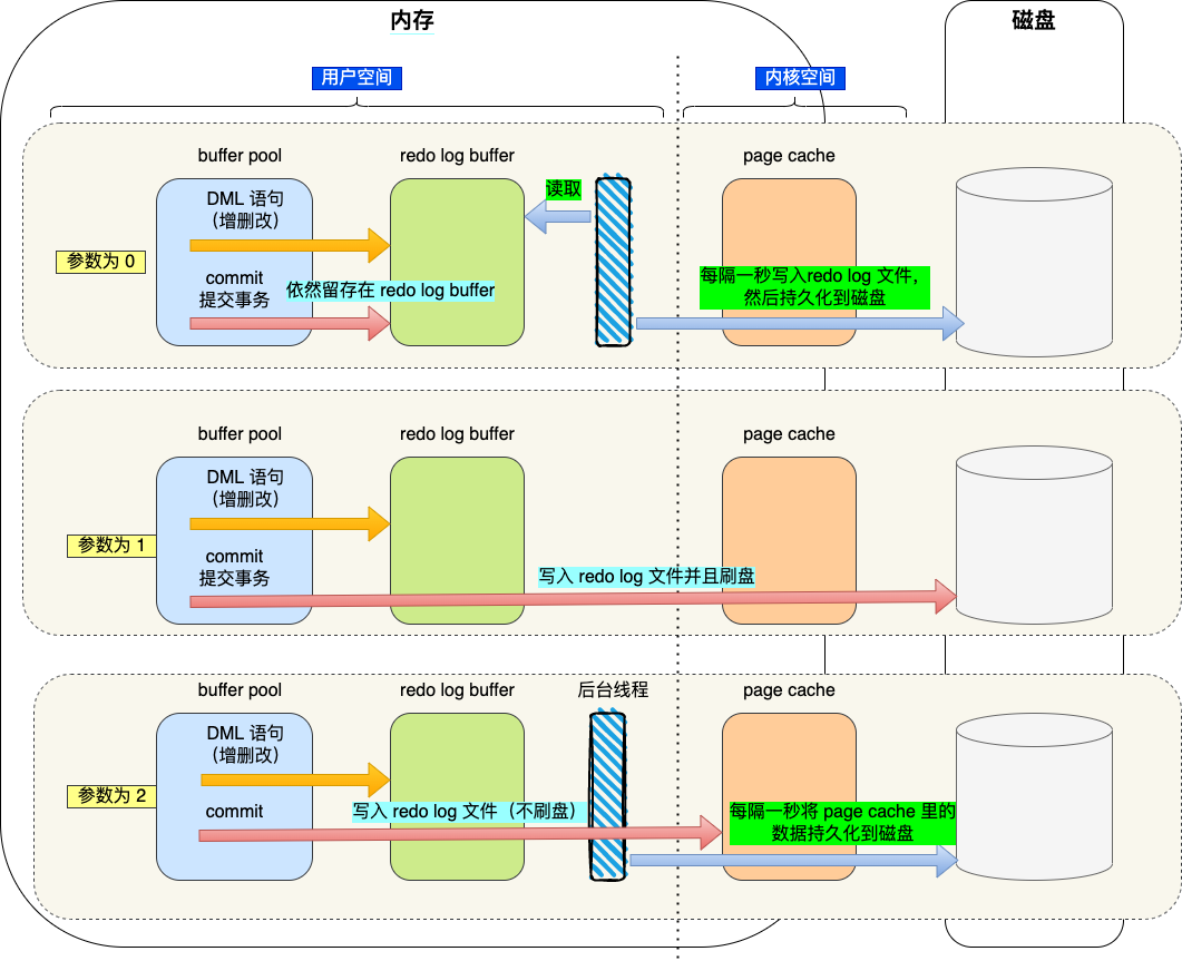 设置为 2。表示每次事务提交时,都只是缓存在 redo log buffer 里的 redo log 写到 redo log 文件,注意写入到「 redo log 文件」并不意味着写入到了磁盘,因为操作系统的文件系统中有个 Page Cache,专门用来缓存文件数据的,所以写入「 redo log文件」意味着写入到了操作系统的文件缓存,然后交由操作系统控制持久化到磁盘的时机。但是这样做的风险是,主机掉电的时候会丢数据。具体更新一条记录 UPDATE t_user SET name = 'xiaolin' WHERE id = 1; 的流程如下: