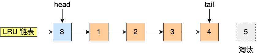 而如果接下来访问了8号页,因为8号页不在 Buffer Pool里,所以需要先淘汰末尾的5号页,然后再将8号页加入到头部
