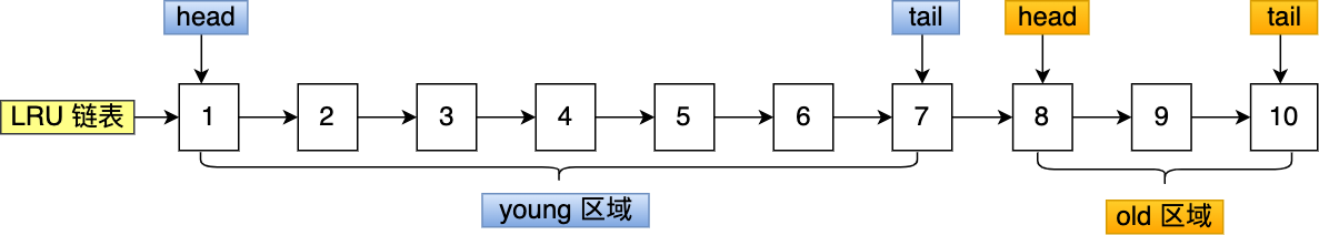 young 区域在 LRU 链表的前半部分,old 区域则是在后半部分,如下图: