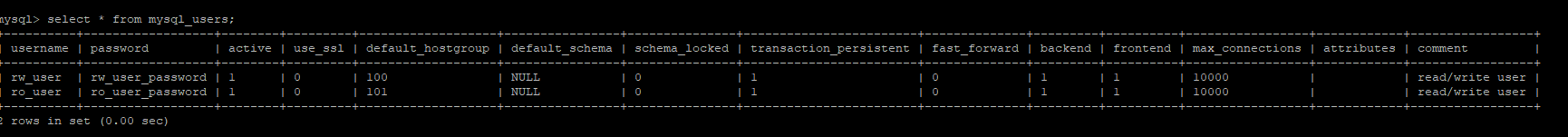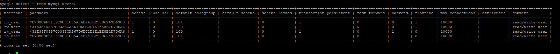 | username | password | active | use_ssl | default_hostgroup | default_schema | schema_locked | transaction_persistent | fast_forward | backend | frontend | max_connections | attributes | comment |