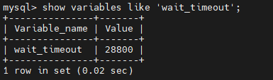 从上图可以看出有许多空闲连接,MySQL 定义了空闲连接的最大空闲时长,由 wait_timeout 参数控制的,默认值是 8 小时(28880秒),如果空闲连接超过了这个时间,连接器就会自动将它断开。
