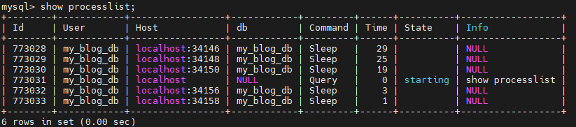 其中”Command”列返回的内容中,“Sleep”表示MySQL相同中对应一个空闲连接。而“Query”表示正在查询的连接。