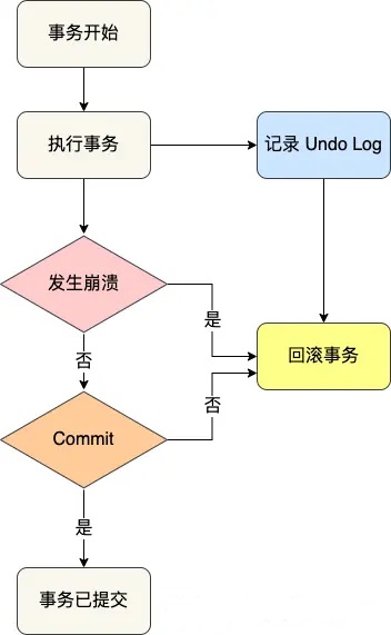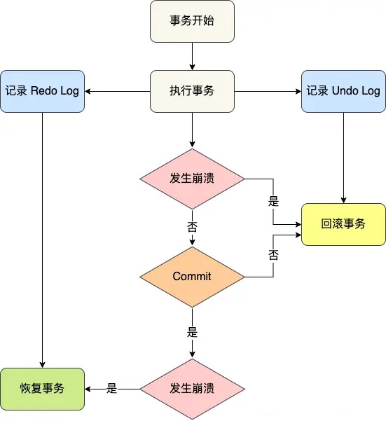 事务提交之前发生了崩溃,重启后会通过 undo log 回滚事务,事务提交之后发生了崩溃,重启后会通过 redo log 恢复事务,如下图: