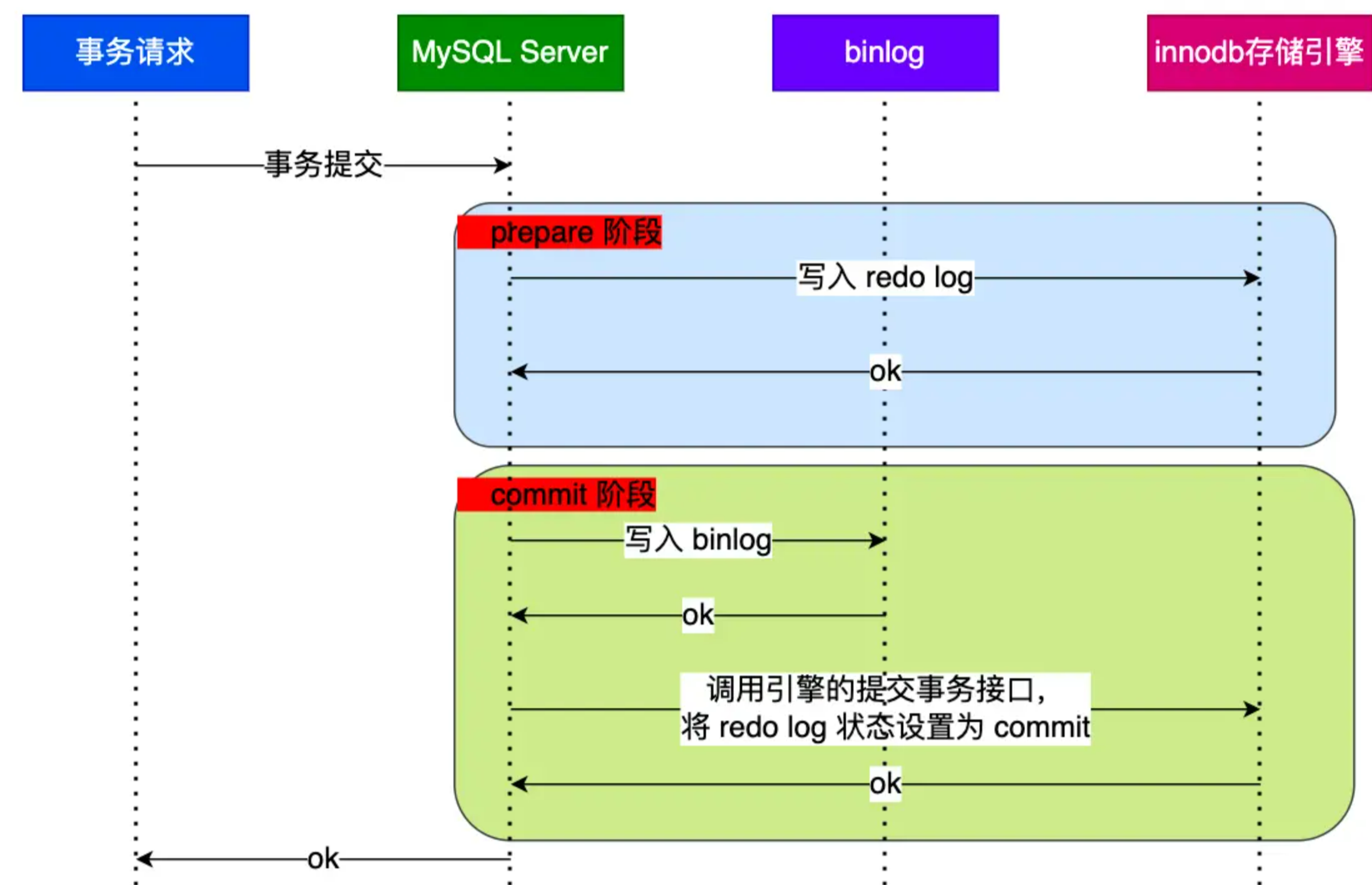 总的来说就是,事务提交后,redo log变成prepare 阶段,再写入binlog,返回成功后redo log 进入commit 阶段。