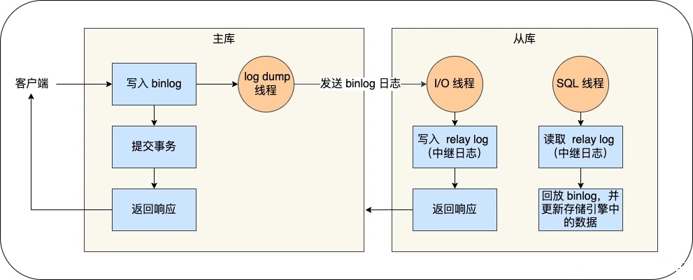 这个过程一般是异步的,也就是主库上执行事务操作的线程不会等待复制 binlog 的线程同步完成。