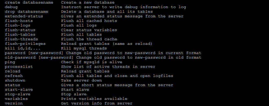 可以通过 : mysqladmin --help 指令查看帮助文档